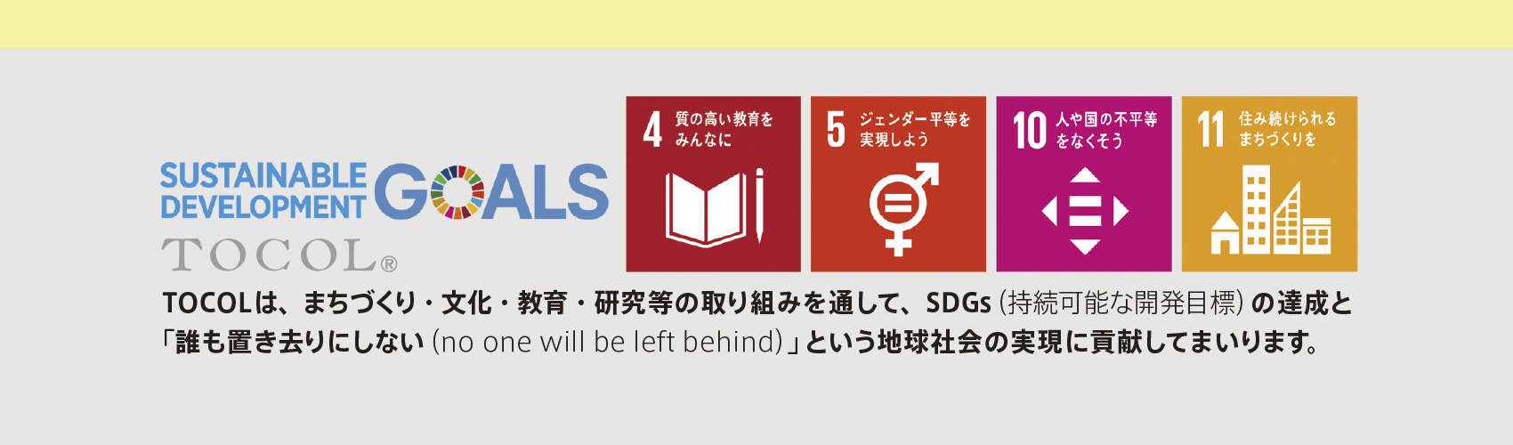 私たちTOCOLは、教育・学術研究・文化芸術・スポーツの発展に貢献することにより、まちづくり、環境保全、国際交流、科学技術の振興、経済活動の活性化を図り、誰も置き去りにしない(no one will be left behind)持続可能な地球社会の実現を目指します。